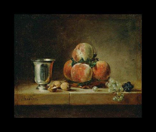 “Şeftalilerle Natürmort” adlı resminde de görüleceği üzere Chardin adını kompozisyonlarına sadece “chardin” şeklinde eklerdi.