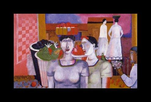Tamayo baskıları, ayırt etmesi oldukça kolay ve dikkatle etiketlenmiş ve numaralanmış olsa da, yağlı boya eserlerini ayırt etmek o kadar da kolay değildir. Baskılarının oldukça ayırt edilebilir bir tekniği ve renk paleti varken yağlı boya eserleri aralarında çok keskin bir fark olmasa da çeşit çeşittir. Tamayo, “Tehuantepec’in Kadınları” (1939) adlı resminde kırmızılar, sarılar ve toprak tonlarından oluşan renk şemasından uzaklaşmıştır. Teyzesinin meyve tezgahını hafızasından resmettiği bu tabloda beyaz, mavi ve yeşil tonlarını kullanmıştır. Resmin arka planı sanatçının sıcak renk şemasını yansıtsa da soğuk renkler göze çarpmaktadır.